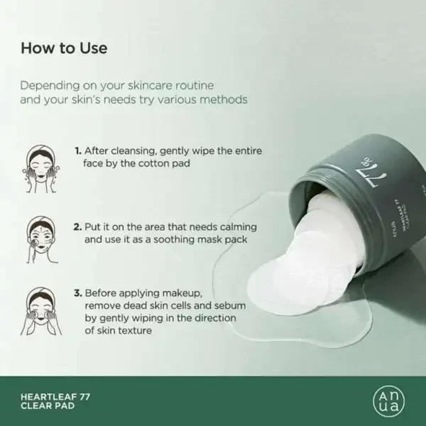 Anua Heartleaf 77 Clear Pad is a daily exfoliating toner pad infused with 77% Heartleaf Extract and PHA to gently remove dead skin cells, control sebum, and soothe irritation. Designed for sensitive and acne-prone skin, these pads help tighten pores, improve skin texture, and provide hydration for a clear, radiant complexion.