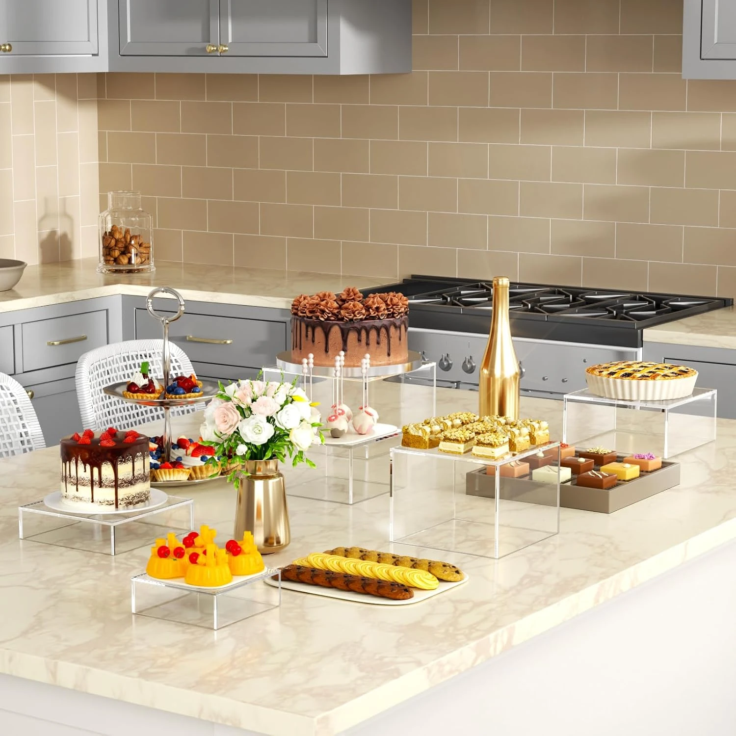 Show off your delicious creation: The food risers for the buffet table are made of thick acrylic, durable and stable enough to support any plate with food, and wine glasses, elegantly display your beautiful desserts for your family and guests, making them leave a deep impression.