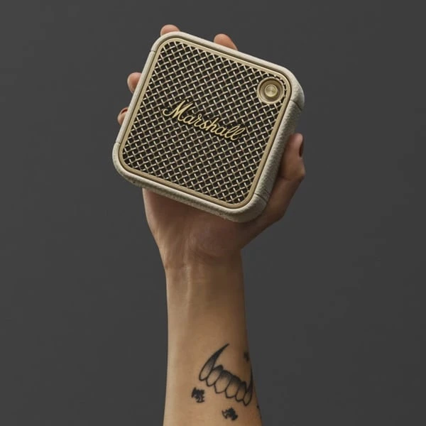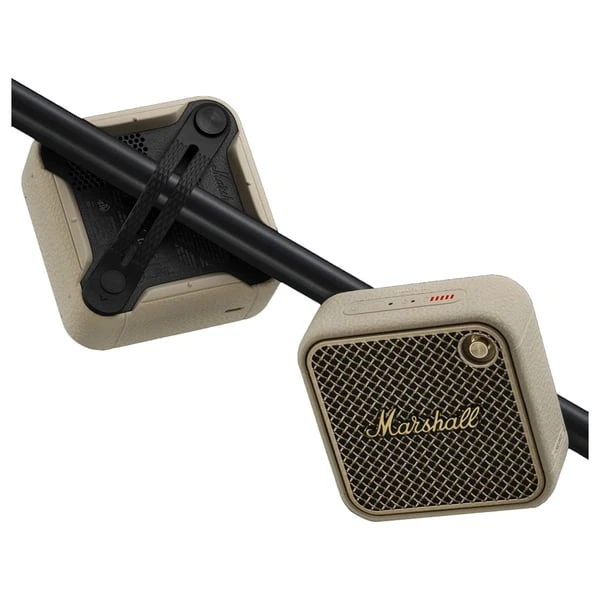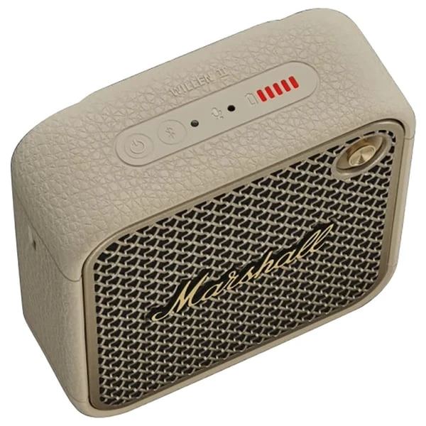 The Marshall Willen II in Cream is a compact, rugged, and stylish portable Bluetooth speaker designed for on-the-go music lovers. Delivering powerful sound with a 10W full-range driver and dual passive radiators, it ensures rich audio quality. With an IP67 rating, it's dustproof and waterproof, making it perfect for outdoor adventures. The built-in microphone allows for hands-free calls, and the multi-directional control knob provides easy navigation. Its eco-friendly design incorporates 70% post-consumer recycled plastic and is PVC-free.