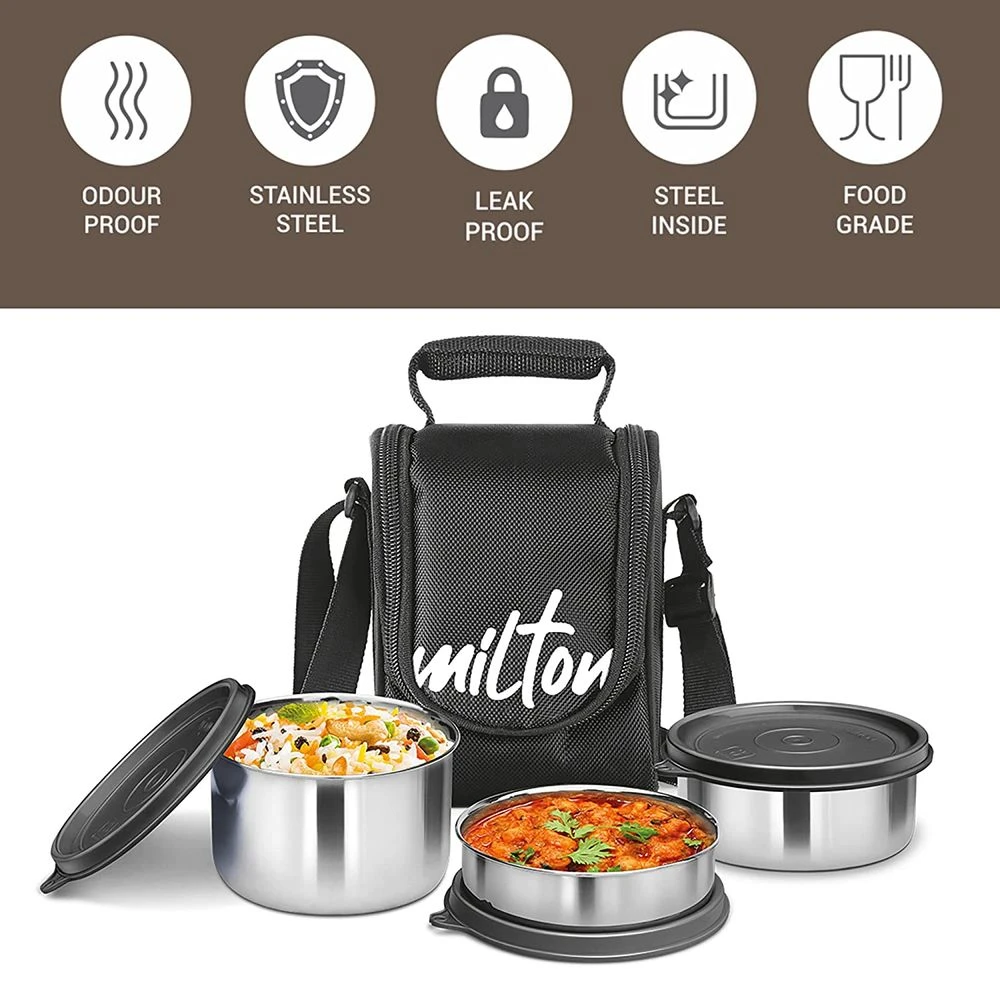 The Milton Tasty 3 Stainless Steel Containers with Lunch Bag in black is a sleek and practical solution for storing your meals. This set includes three high-quality stainless steel containers that are designed to keep your food fresh and secure. The accompanying lunch bag adds convenience, offering an insulated and easy-to-carry option for work, school, or picnics. With its durable construction and stylish design, the Milton Tasty set ensures your meals are always ready to go and stay at the perfect temperature.