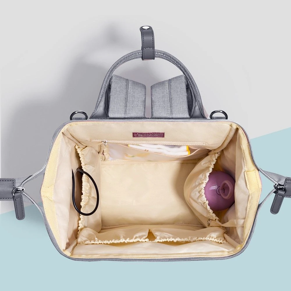 Smart interior layout to hold diapers, wipes, bottles, clothing, and snacks.